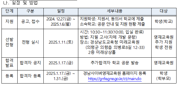2025학년도 경상남도사이버영재교육원 영재교육대상자 추가 선발 전형을 다음과 같이 안내하오니 관심있는 학생들의 추가 지원 바랍니다.