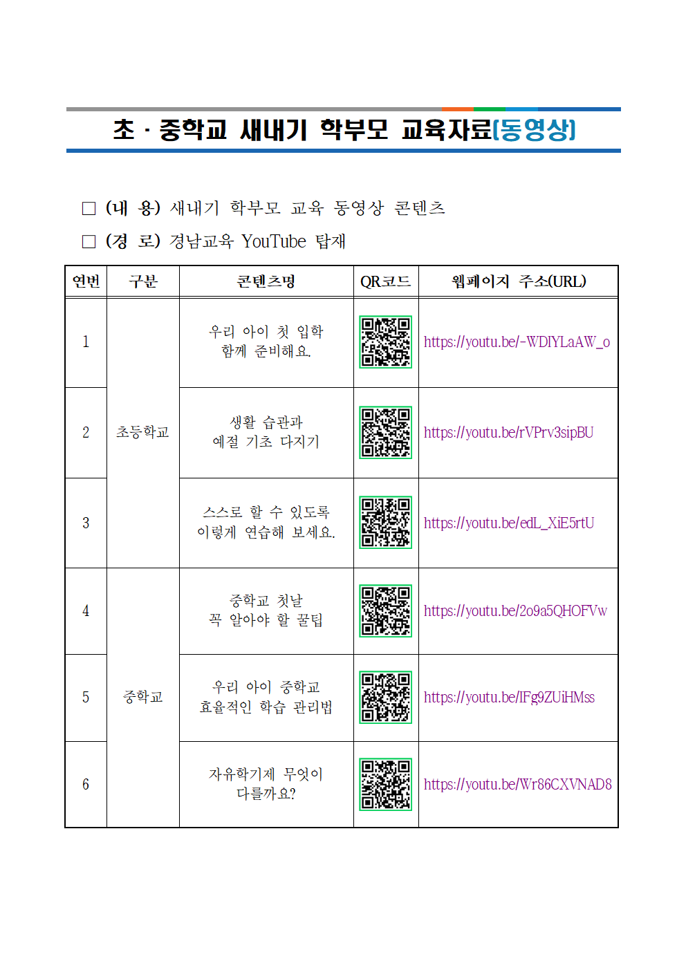 경남교육청에서 학교 교육에 대한 이해도 제고와 학교 적응력 향상을 위해 “초·중학교 새내기 학부모 교육 자료(동영상)”을 제작하여 보급합니다.