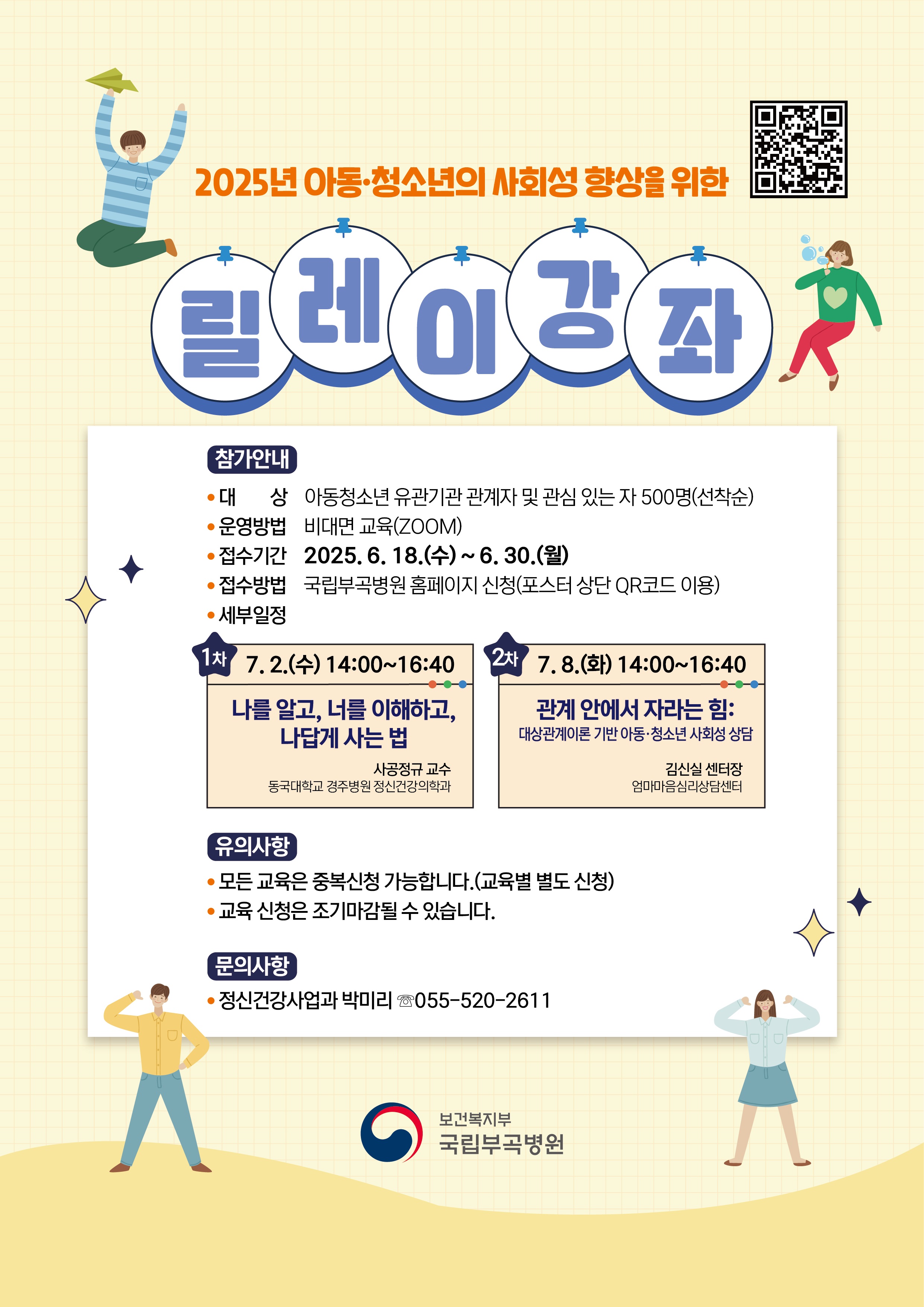 「2025년아동·청소년 사회성 향상을 위한 릴레이 강좌」를 안내드리니 희망하는 학부모님의 참여 있으시길 바랍니다. 가. 주 제: 2025년 아동청소년 사회성 향상을 위한 릴레이강좌 나. 개 요 일 정 | (1차) 2025. 7. 2.(수) 14:00~16:40 | (2차) 2025. 7. 8.(화) 14:00~16:40 | 강의명 | 나를 알고, 너를 이해하고, 나답게 사는 법 | 관계 안에서 자라는 힘: 대상관계이론 기반 아동청소년 사회성 상담 | 강 사 | 동국대학교 경주병원 정신건강의학과 교수 사공정규 | 엄마마음심리상담센터장 김신실 |